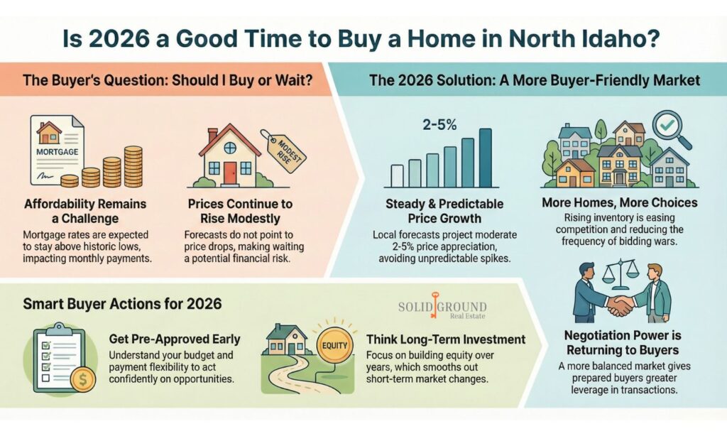 The North Idaho housing market is expected to continue steady, modest price appreciation in 2026, supported by ongoing demand and relatively balanced supply. Buyers may find more flexibility compared to recent years, with inventory improving and negotiation opportunities increasing, even as mortgage rates remain above historic lows and affordability challenges persist. 2026 looks like a buyer-friendly shift compared to the frenzy of previous years, especially if you’re prepared, informed, and working with a local expert.